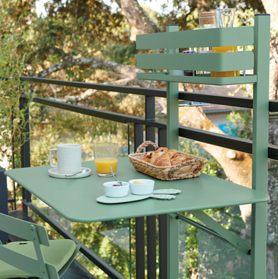 The Fermob Bistro Balcony Table is the “I have no floor space” hero. It folds away and mounts to a balcony rail or wall with an adjustable stainless-steel fastening system, so you get a proper coffee-and-laptop surface without sacrificing the whole balcony footprint. It’s designed to seat up to two, which is basically perfect for a small-space date night or a solo morning reset.