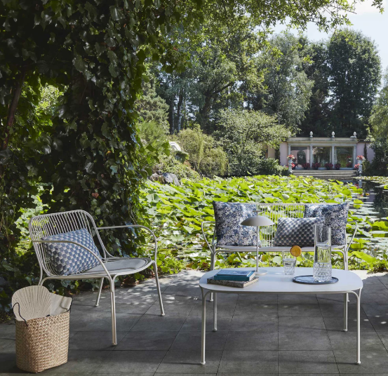 The Kartell Hiray Lounge Chair is your “proper lounge zone” anchor. It’s made with a welded wire process and marine-grade painted galvanised steel, designed to hold up outdoors (including salt fog testing), so you get that airy, sculptural look without worrying you’re babying it. It’s suitable for indoor/outdoor use and can be paired with an optional cushion.