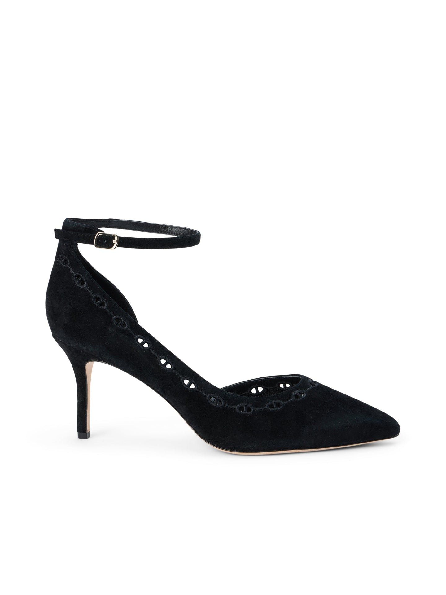 The Cezanne pump by L'Agence is a versatile, elegant shoe with subtle tonal eyelet details and chic side cutouts. Crafted from timeless black suede, it comfortably molds to the foot and is secured with an adjustable ankle strap. The pointed toe and slim heel offer a classic silhouette, perfect for office wear or special occasions