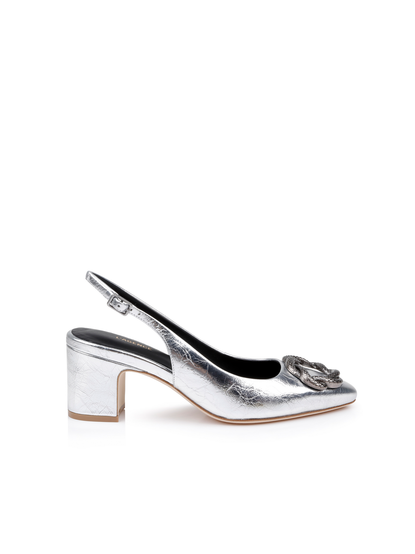 This bright silver slingback shoe exudes modern glamour with a patent leather upper and a sleek almond toe. It features a stylish silver brooch accent, an adjustable buckle strap for a custom fit, and a comfortable block heel, making it an ideal choice for any occasion.