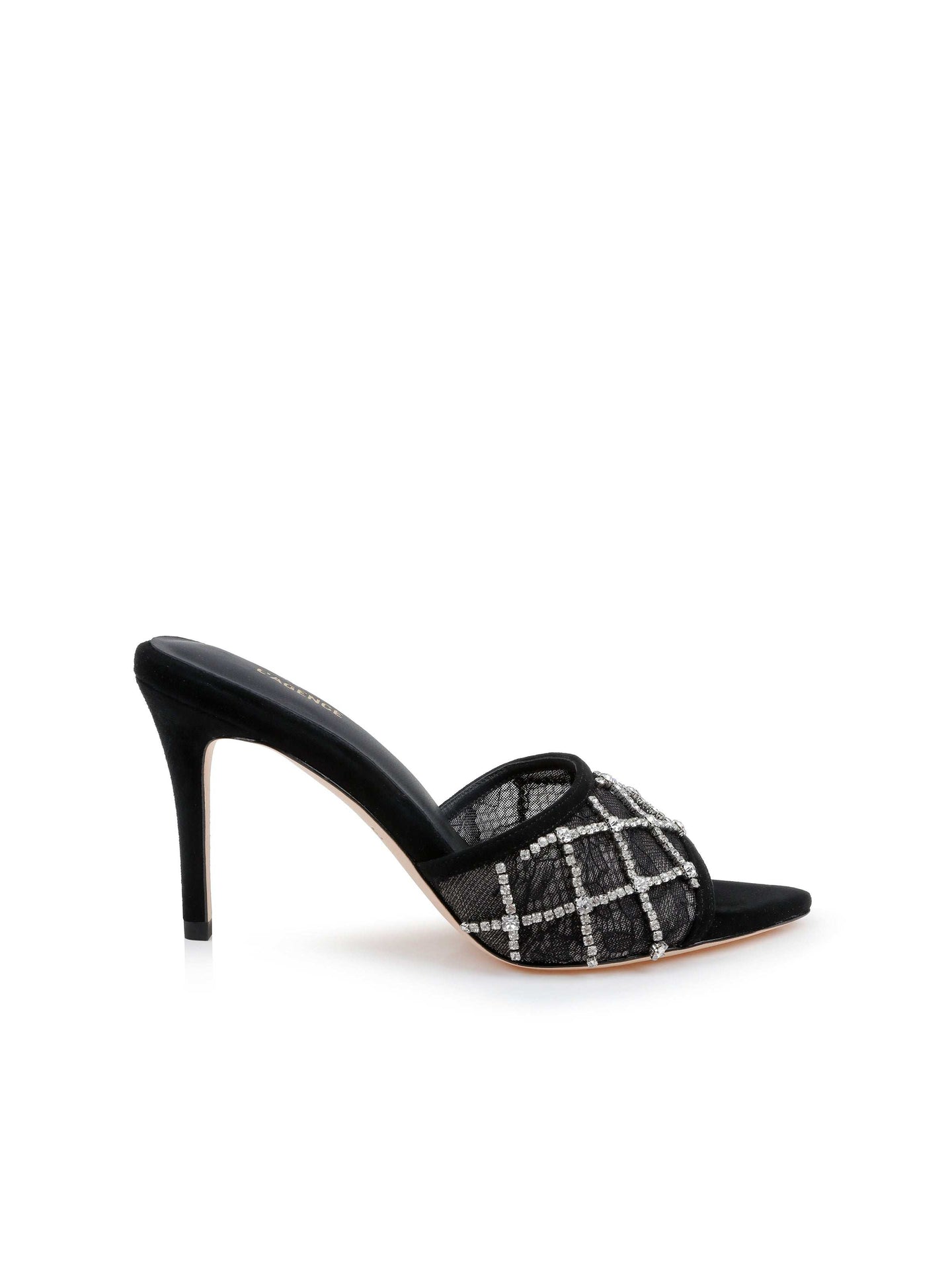 The Fernande mule by L'Agence brings glamour to any outfit, featuring a delicate lace upper adorned with crystal embellishments. Perfect for soirées or adding sparkle to casual looks, this mule combines a pointed toe and stiletto heel with a 6mm memory foam insole for comfort.